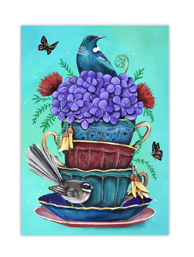 Designed by local NZ artist Fiona Clarke. Piled high with Teacups and decorated with native flora like Pohutukawa & Kowhai and Fauna like Tui & Piwakawaka.