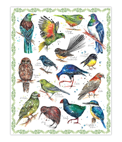 Designed by local NZ artist Fiona Clarke, it captures the majestic beauty of our native birds through vibrant colours.