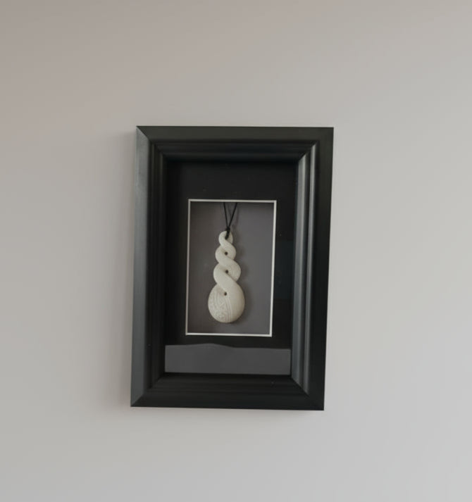This Framed bone carving features the Twist symbol, representing everlasting friendship, unity, and eternity. The carving can be displayed by hanging or freestanding.