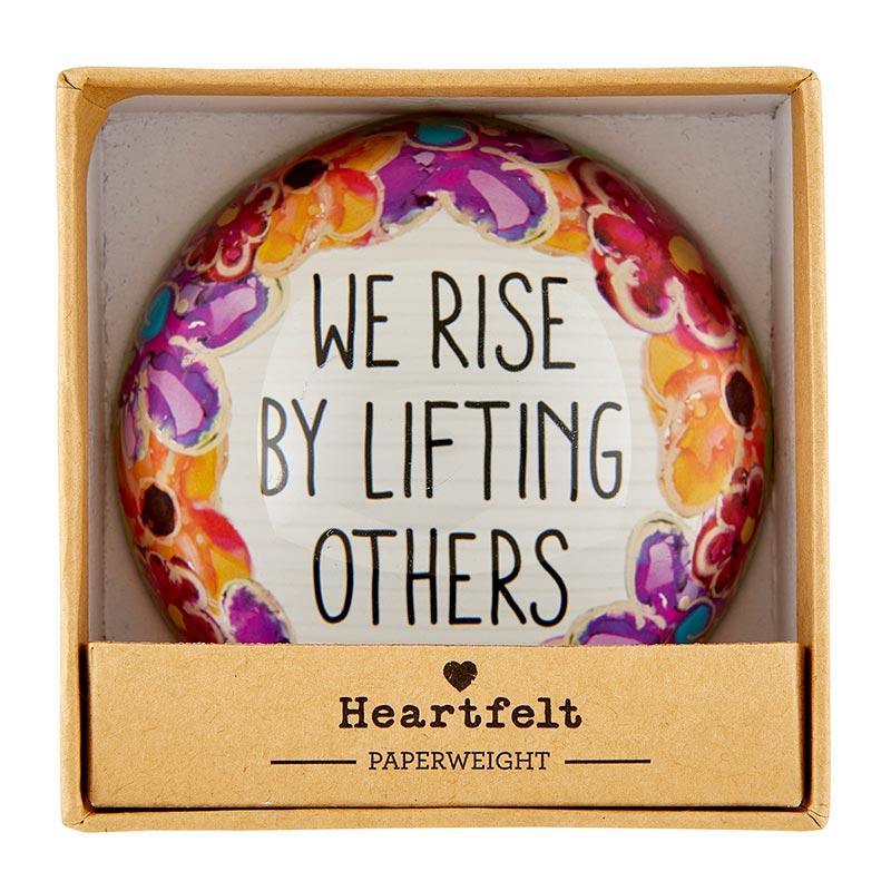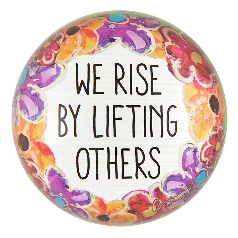 Reads: We rise by lifting others. Features the beautiful artwork, solid glass and felt bottom.