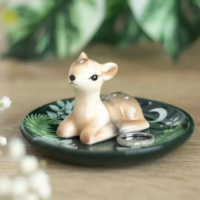 The Green Forest Fawn Trinket Dish is charming ceramic piece that showcases a peaceful fawn nestled among lush forest foliage, adding a touch of woodland magic to any space.