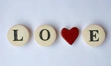 These classic love pebbles are one of our most popular items. Timeless in design and suited to many decors they are the perfect gift for so many occasions. Handmade unglazed pebbles of white clay with letters stamped into them, accompanied by a glazed jammy red cadmium heart make them a stunning addition to any home.