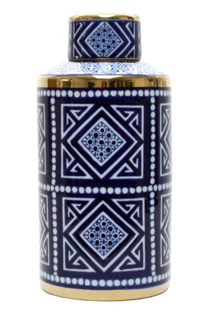This stunning blue and gold ceramic Cylinder Jar adds a sense of luxury and elegance to your Hampton style decor.