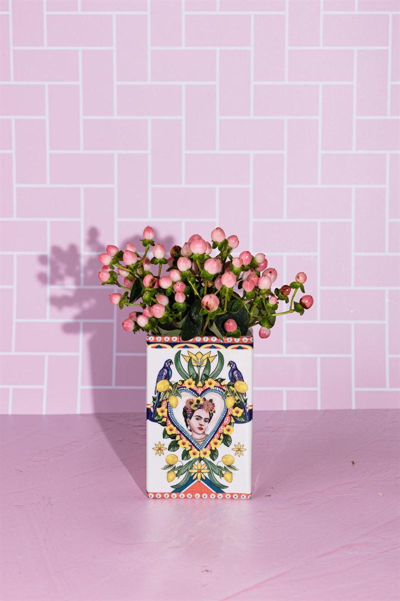 Rectangular shaped ceramic vases featuring Frida Kahlo imagery with exotic birds and flowers. The lavish detailed artwork and rich colours make these Mexican Folklore Vases quite spectacular and a real centrepiece on their own or as a set of three.