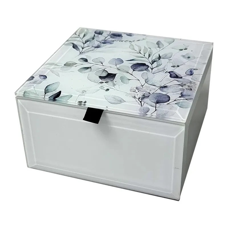 Glass mirror patterned jewellery box with single storage area felt lined. Hand crafted to the finest finish with all glass edges beveled to give it a superior finish.
