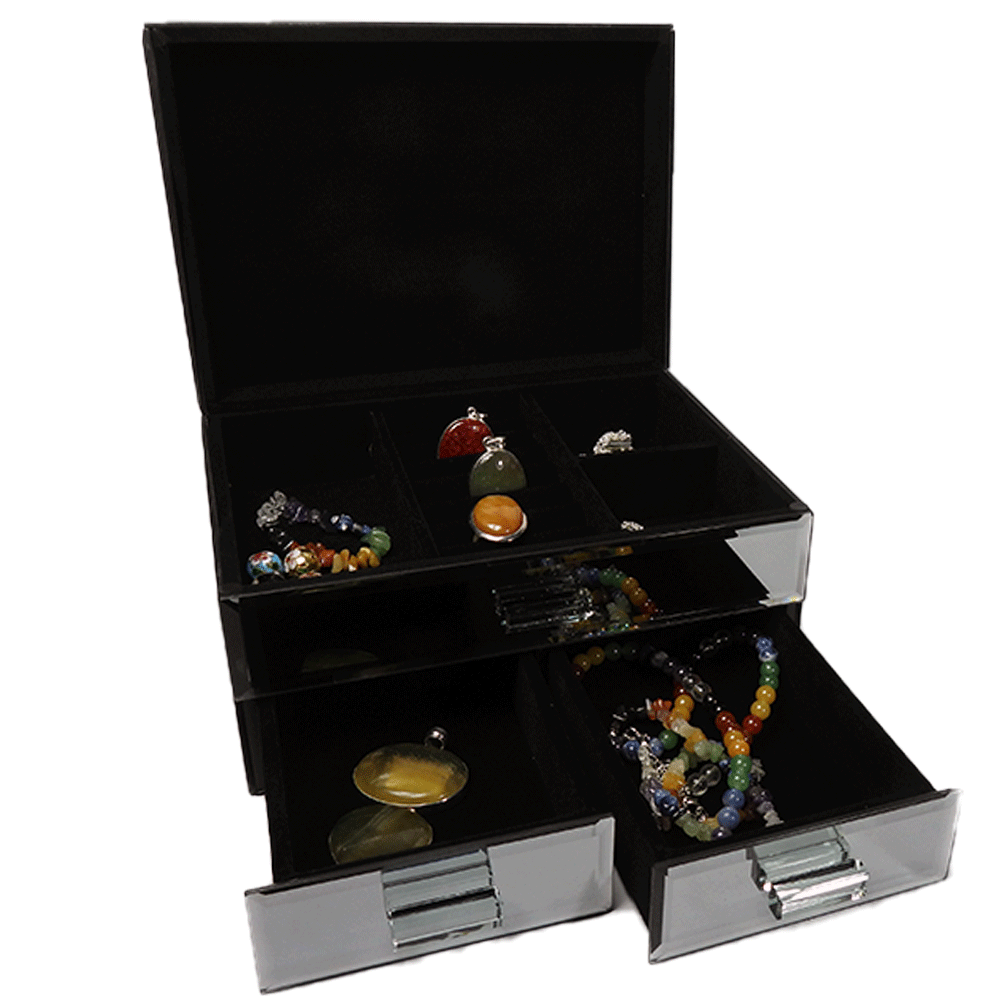 lass mirror patterned jewellery box with top opening storage area felt lined split into 3 compartments & ring storage + 2 drawers. Hand crafted to the finest finish with all glass edges beveled to give it a superior finish.